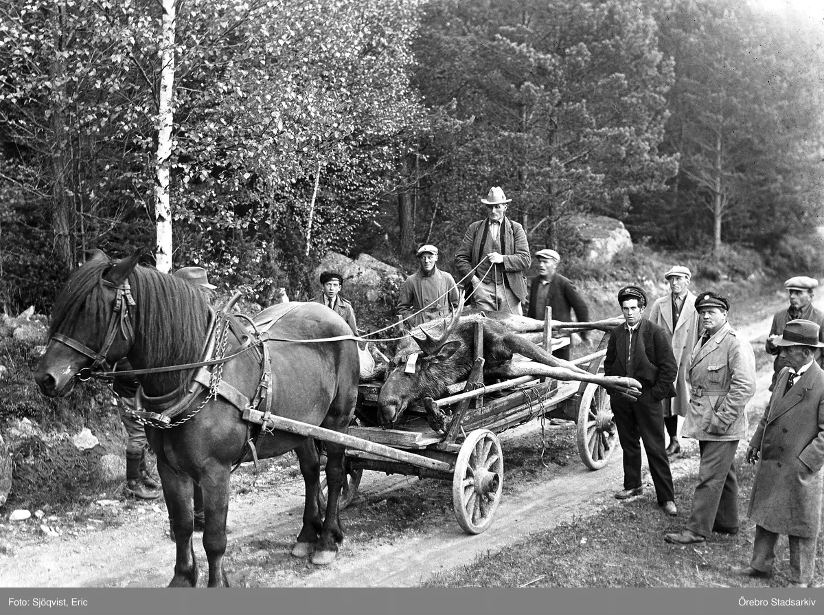 Hästtransport av fälld tjur vid kunglig älgjakt, 1940-tal