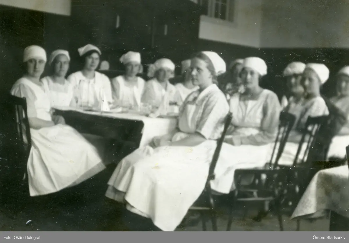 Elever i klass II grupp 1 vid Örebro läns småskollärarinneseminarium sittade vid dukade bord i skolköket, 1920-tal