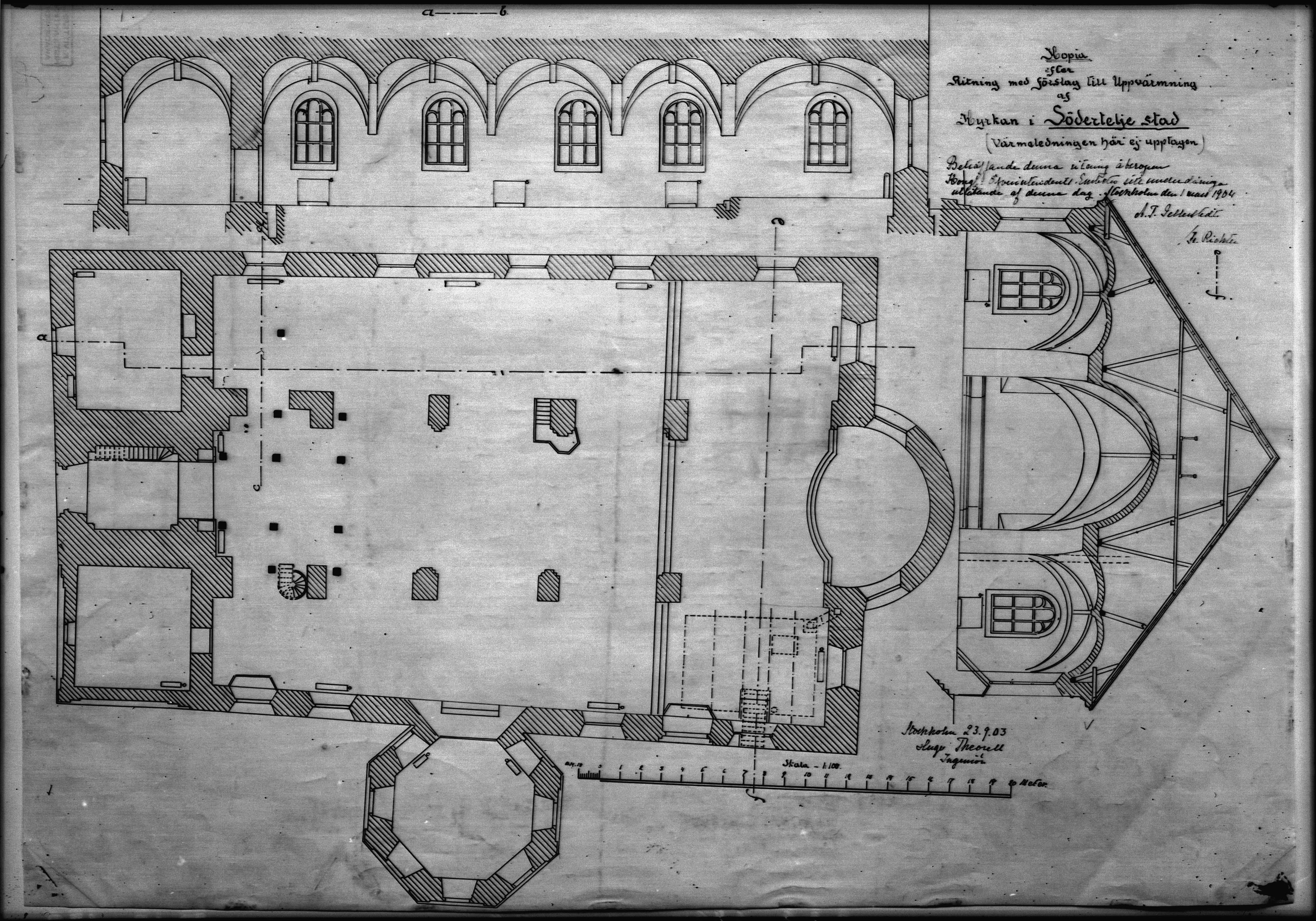 Planritning och genomskärning, i samband med installation av värmeledning, 1903.