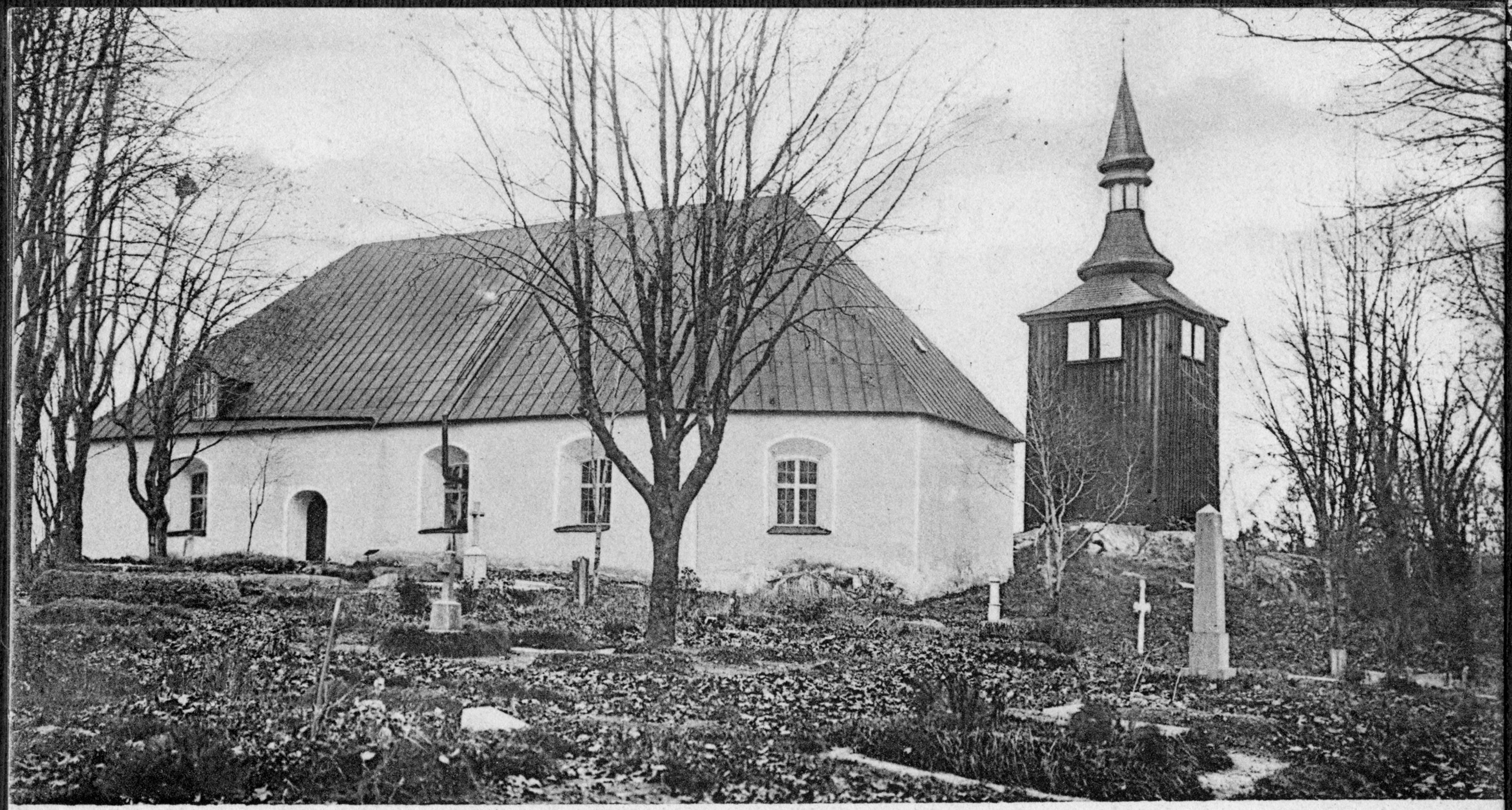 Kyrkan och klockstapeln mot sydöst. Vykort.