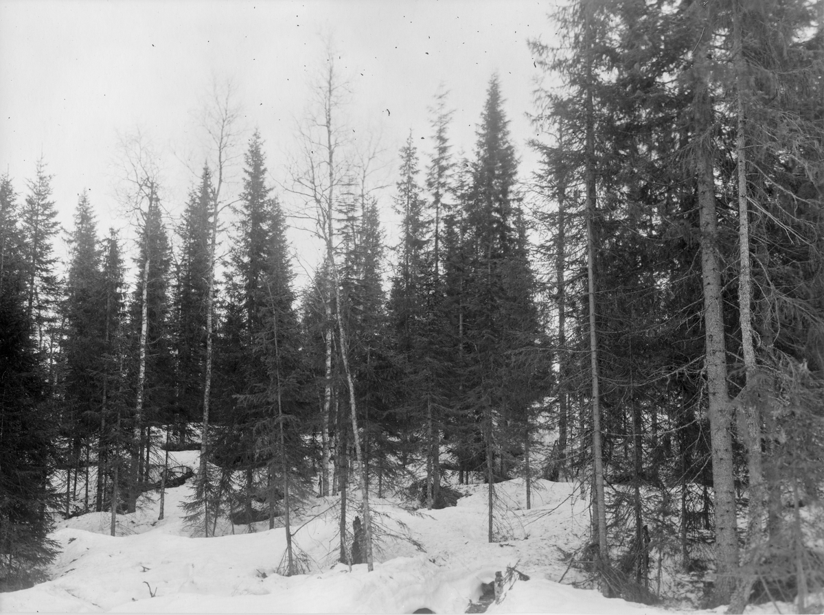 Vägseleskogen. Trakt: Navarträskliden, norra sluttningen omedelbart söder om landsvägen Vilhelmina-Lycksele. Beståndsbild från brandfält 3 C:a 450 m över havet. Beståndet röjt 1934; avverkat (gallring och överståndare) vintern 1937-38. Brandår 1839.