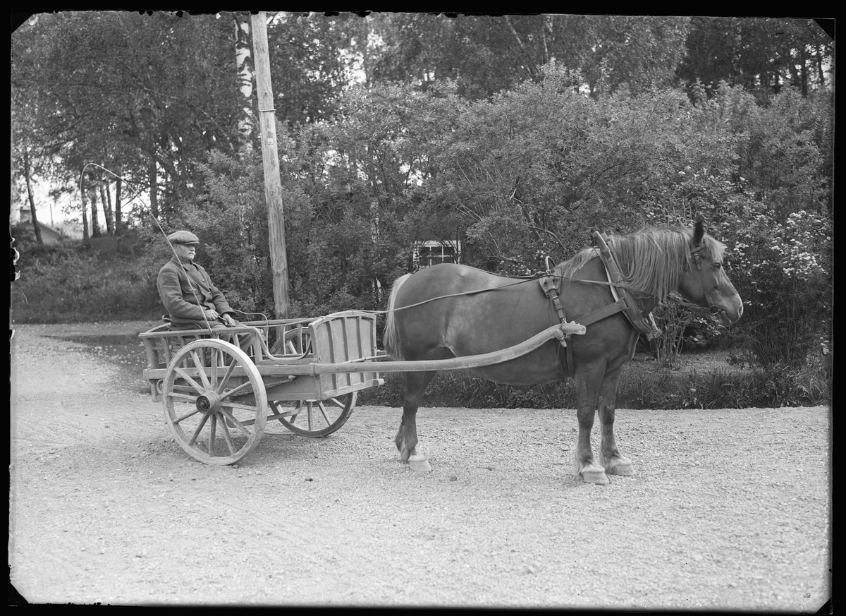 Man med häst och vagn. Gustaf Karlsson, Hällby, Kolbäck.