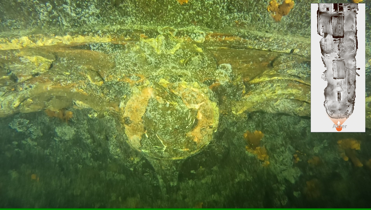 Centrala delen av akterspegeln med ett kvinnoansikte (Annie?) i profil.