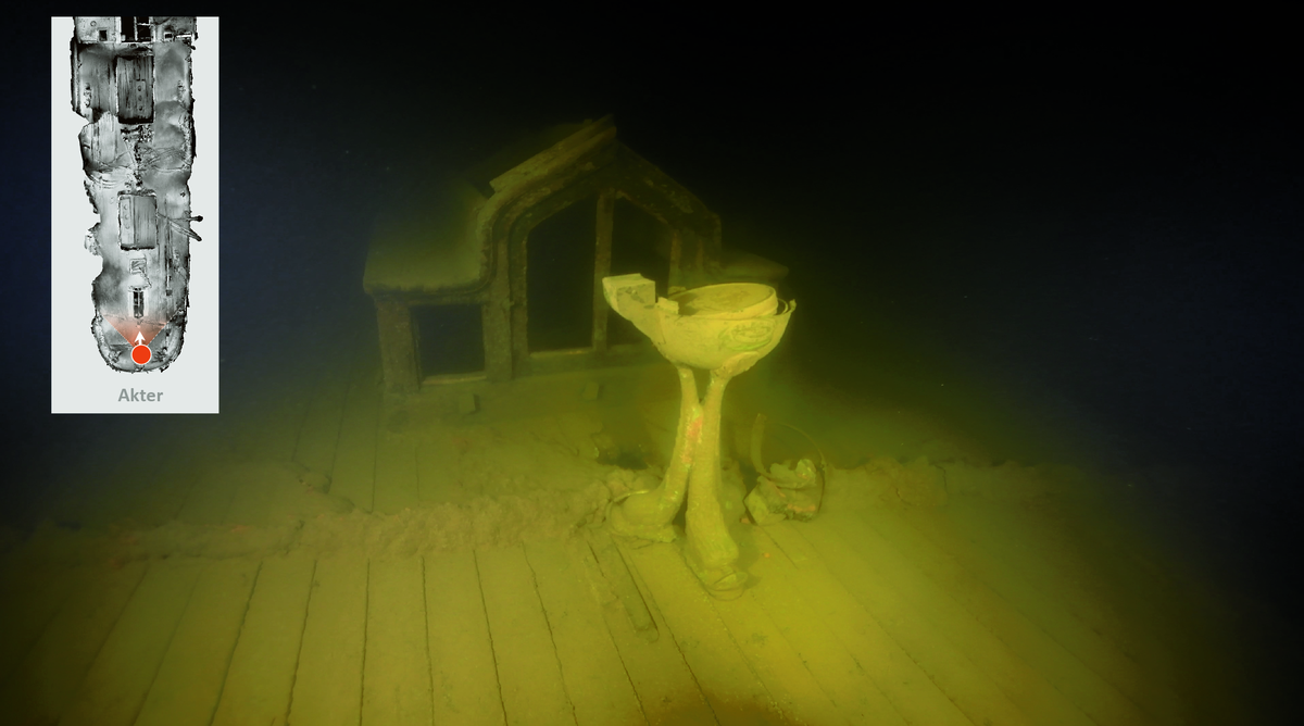 Kompasstativ med fiskfötter. Kompassen intakt inkl. glaset. I bakgrunden syns däckshuset.