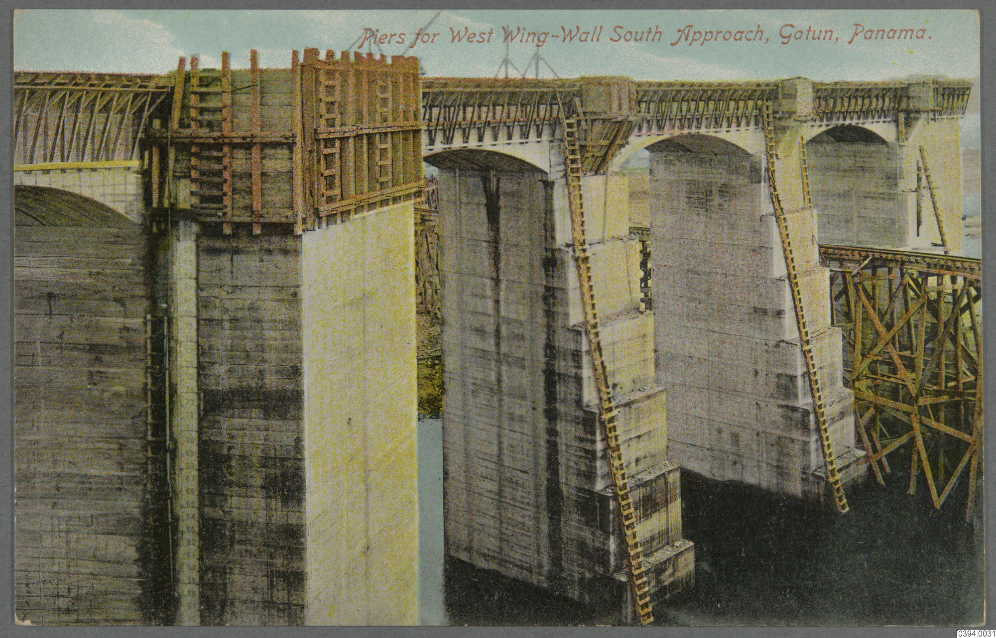 Vykort med motiv av bygget av Panamakanalen vid Gatunsjön. Text på framsida: Piers for West Wing-Wall South Approach, Gatun, Panama" Text på baksida: "Post Card, Place Postage Here, Domestic Island Possessions Canada Cuba Mexico Panama, 1 c, Foreign 2 c, Vibert & Dixon, Kodaks, Magazines, etc., Panama. No. 133. Statens etnografiska museum"