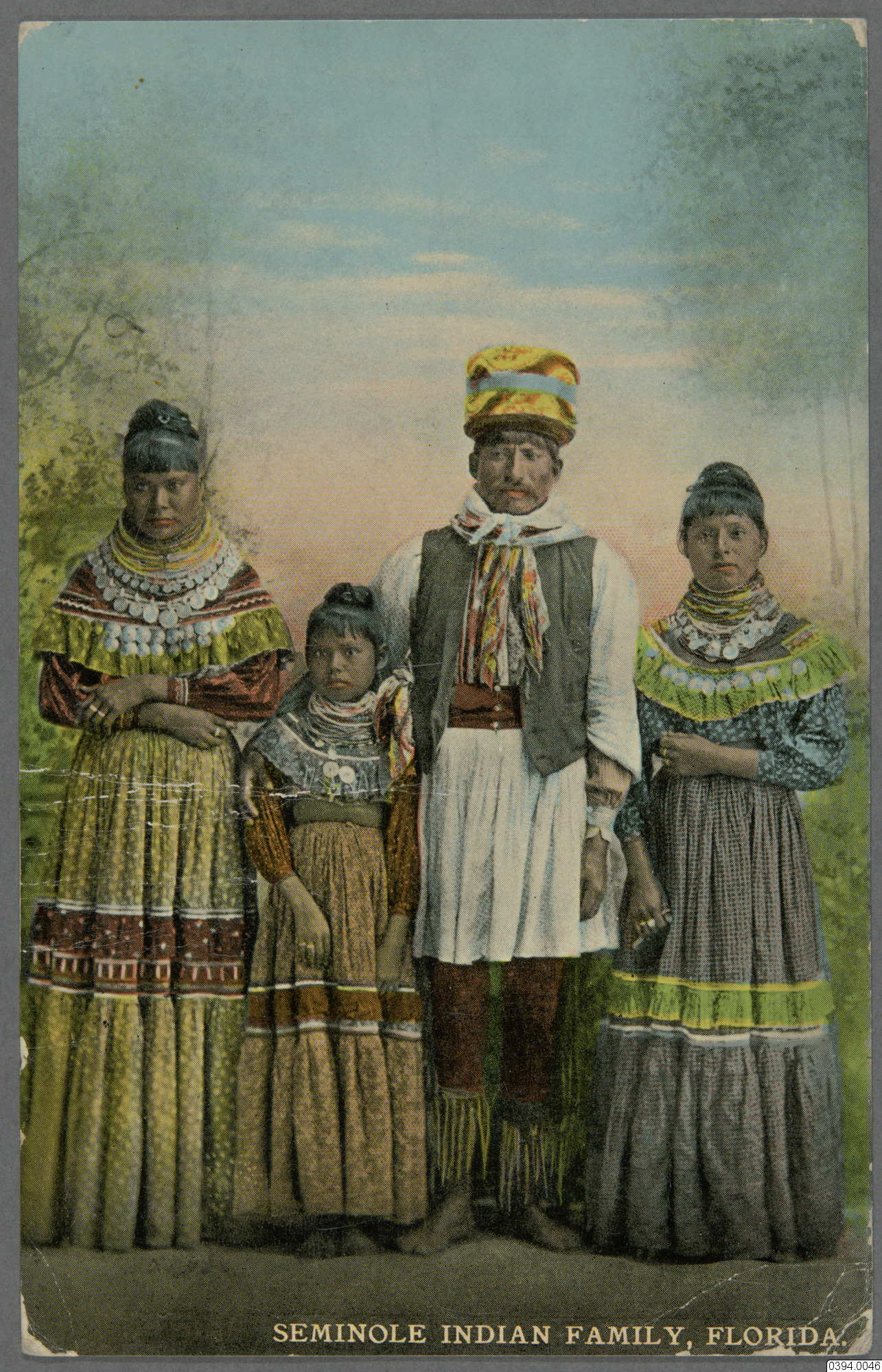 Vykort. skrivet av Cronholm och skickat till Hartman. Motiv av familj, Seminolefolket, Florida. Text på framsida: " Seminole Indian family, Florida. Text på baksida: Pub. By the H & W.B Drew Co. Jacksonville Fla. 1318, Florida Artistic Series, Post card, Message, St. Augustine, Florida, 17/4 1914 på väg till Mexiko, bästa hälsning Frk Cronholm, Professor Hartman, Riksmuseum Stockholm, Sweden. Statens Etnografiska museum."