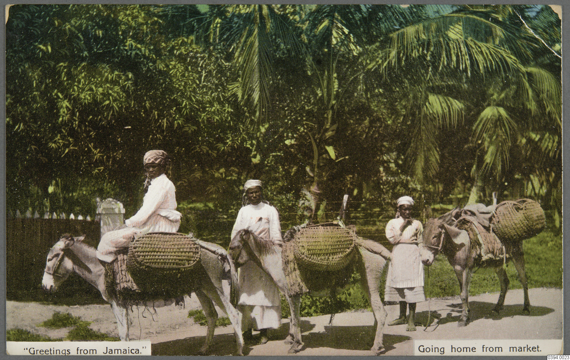 Vykort med motiv från Jamaica på tre personer med åsnor på väg hem från markanden. Text på framsida: "Greetings from Jamaica. Going home from market" Text på baksida: "Union Postale Universelle Post Card, Jamaica (Jamaique) This space may be used for correspondence. For address only. Inland 1/2 d. Foreign 1 d. A. Duperly & Sons, Kingston, Ja. Statens etnografiska museum"