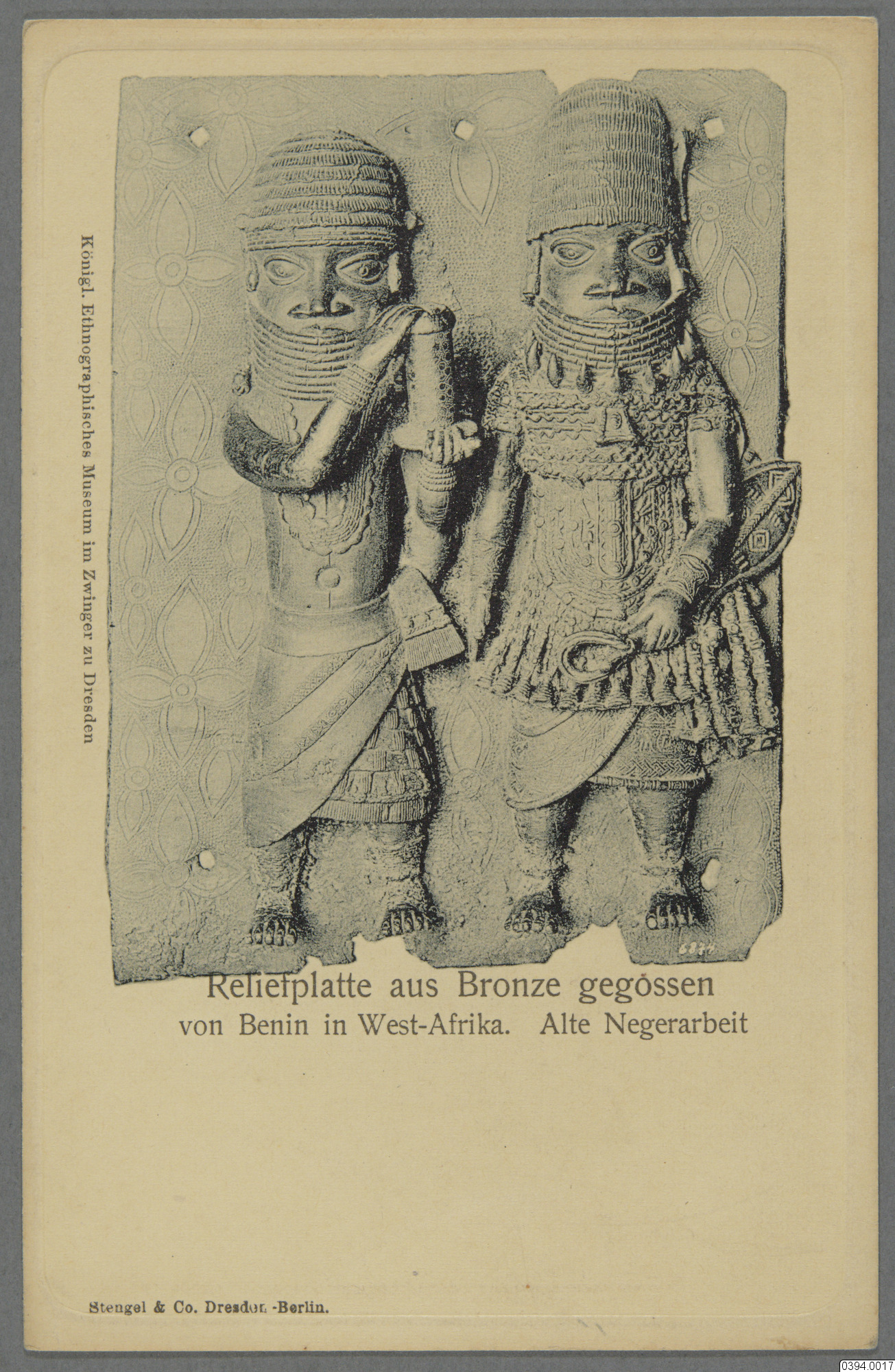 Vykort med motiv av gjuten relief i brons, Västafrika . Text på framsida: "Reliefplatte aus Bronze gegossen von Benuin in Westafrika Alte Negerarbeit. Königl. Ethnographisches Museum in Zwinger zu Dresden. Stengel & Co. Dresden-Berlin" Text på baksida: "Postcarte. Statens Etnografiska Museum".