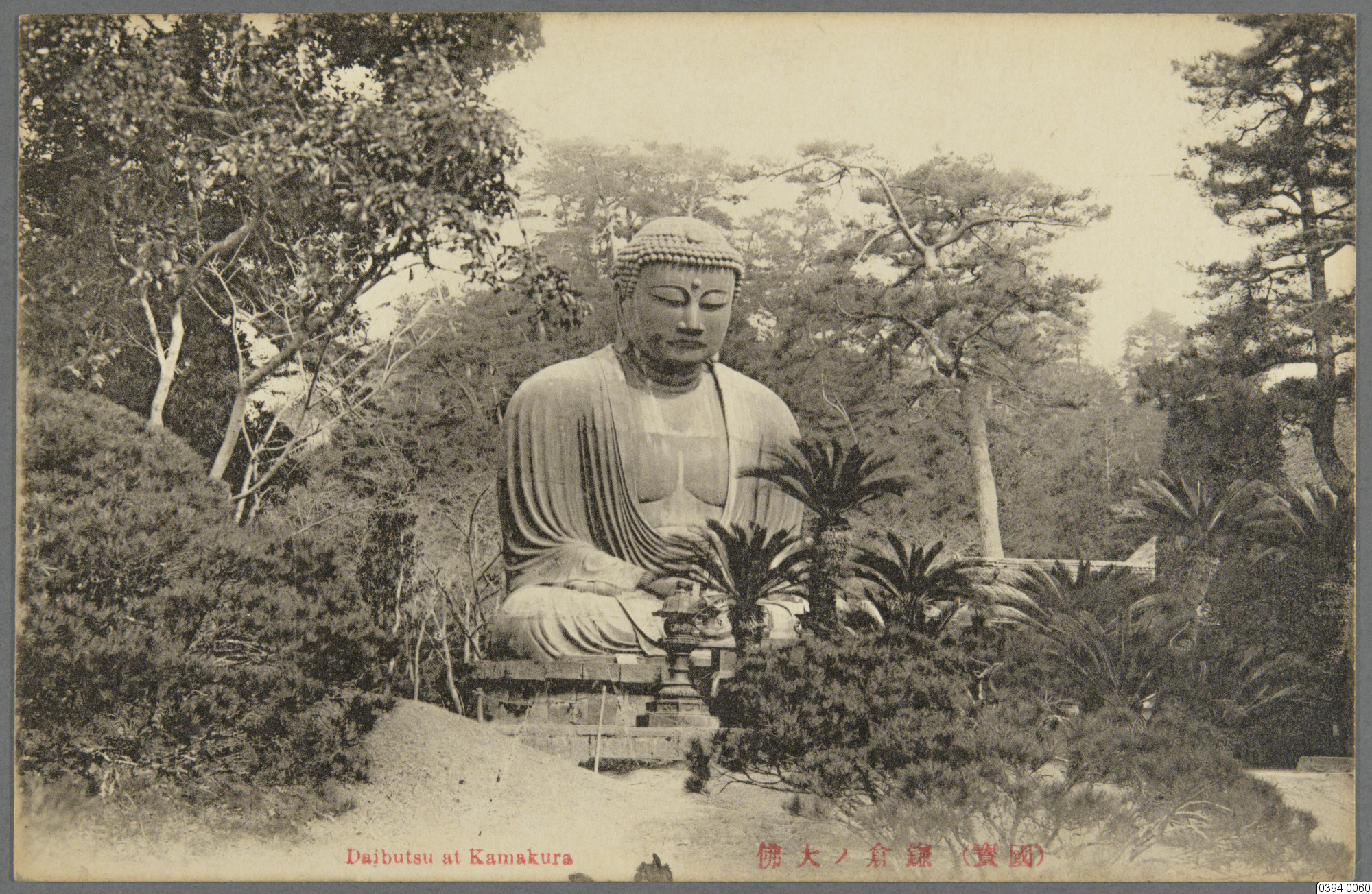 Vykort med motiv av Buddhastatyn "the Great Buddha of Kamakura" i Japan. Text på framsidan: "Daibutsu at Kamakura" Text på baksida: "Union Postale Universelle, Carte Postale, Japan, Statens Etnografiska museum.