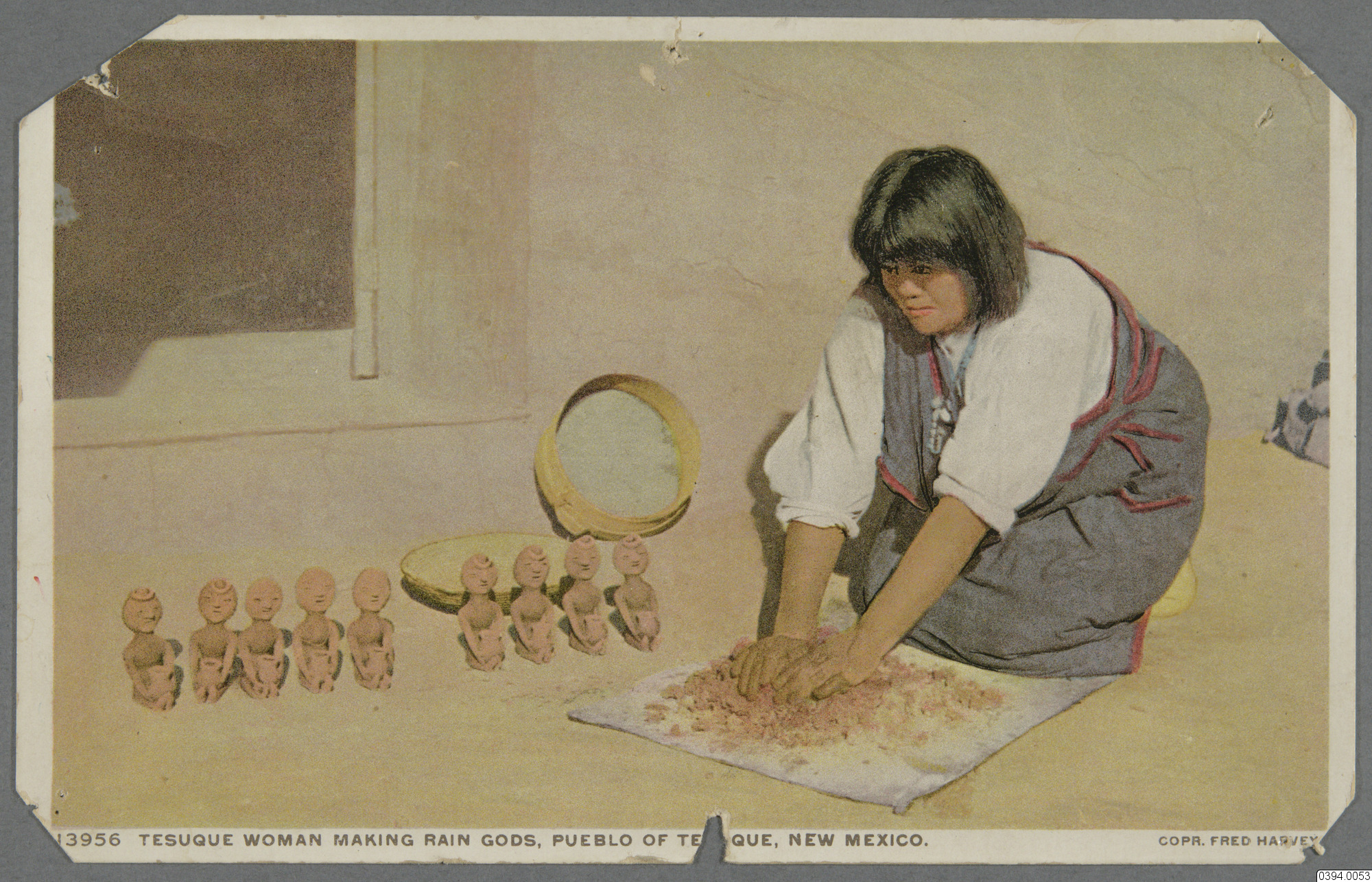 Vykort med motiv av kvinna som tillverkar figurer i lera, Tesuque, Arizona. Text på framsidan: "13956 Tesuque woman making rain gods, Pueblo of Tesuque, New Maxico. Fred Harvey." Text på baksida: "Ferd Arvey. Post card. Place Stamp here. United States and Canada one cent. Foreign two cents. TESUQUE is located on the left bank of the Tesuque River, a few miles north of Santa Fe and numbers about one hundred inhabitants. The town is quadrangular in shape, about 240 feet long and 150 feet wide. The houses rise to a height of two stories, entrance to the second floor being by means of a ladder from the street. The women still prepare their meals on the primitive metates, there being in many houses three or four compartment meal- ing bins, where corn is ground between two stones. Their pottery comprises little images, Rain Gods, and curious animal forms. 'Phostint card' Trade mark - Reg U. S. PAT. Off. Made only by Detroit Publishing Co. Statens Etnografiska museum. This space may be used for message, This space for the address."