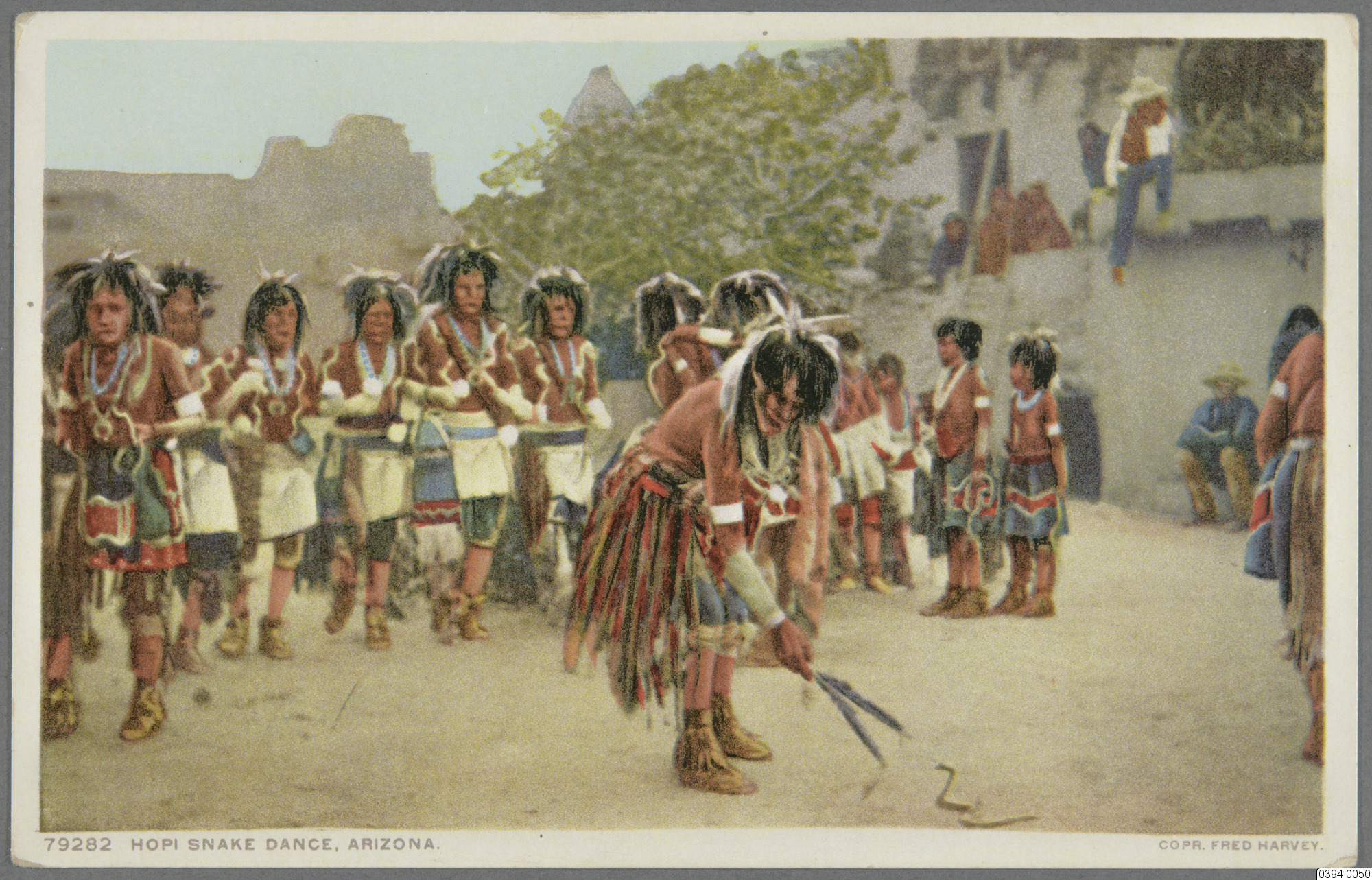 Vykort med motiv av en ceremoni med ursprungsbefolkning i Tewa, Arizona. Text på framsidan: "79672 Black Beard ceremony in the Plaza of Tewa, Arizona. Copr. Fred Harvey."