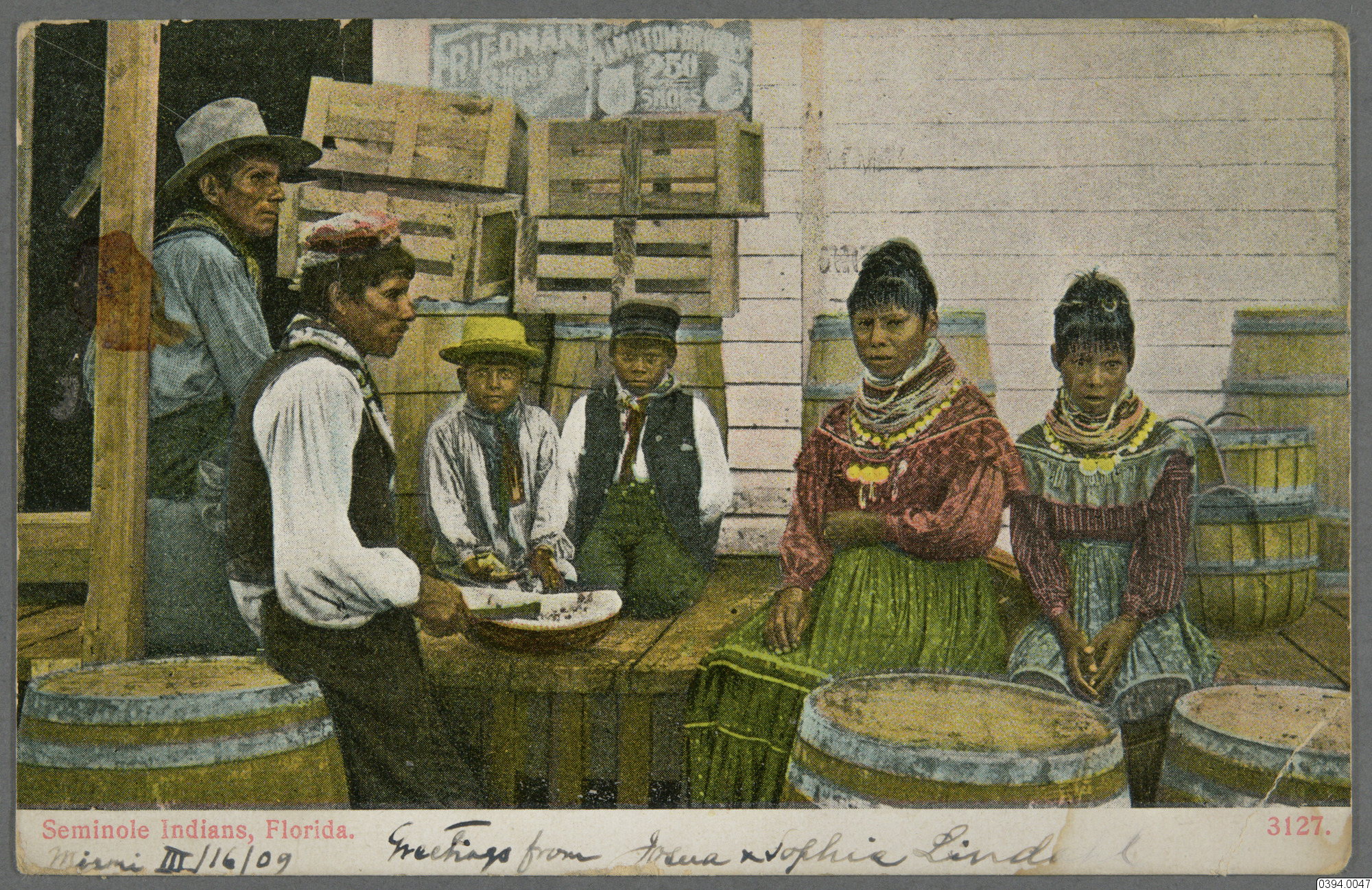 Vykort med motiv av Seminoler, Florida. Text på framsida: " Seminole Indians, Florida. Miami 1909-03-16 (16 mars), Greetings from (oläsligt) & Sophia Lindell (Sofia?)" Text på baksida: "Made in Germany. A. C. Bosselman & Co., New York. Post card, Professor CV Hartman, Etnografiska Museet, Stockholm, Sweden, Statens Etnografiska museum, this side for the address." Amerikanskt rött frimärke, US Postage, two cents.