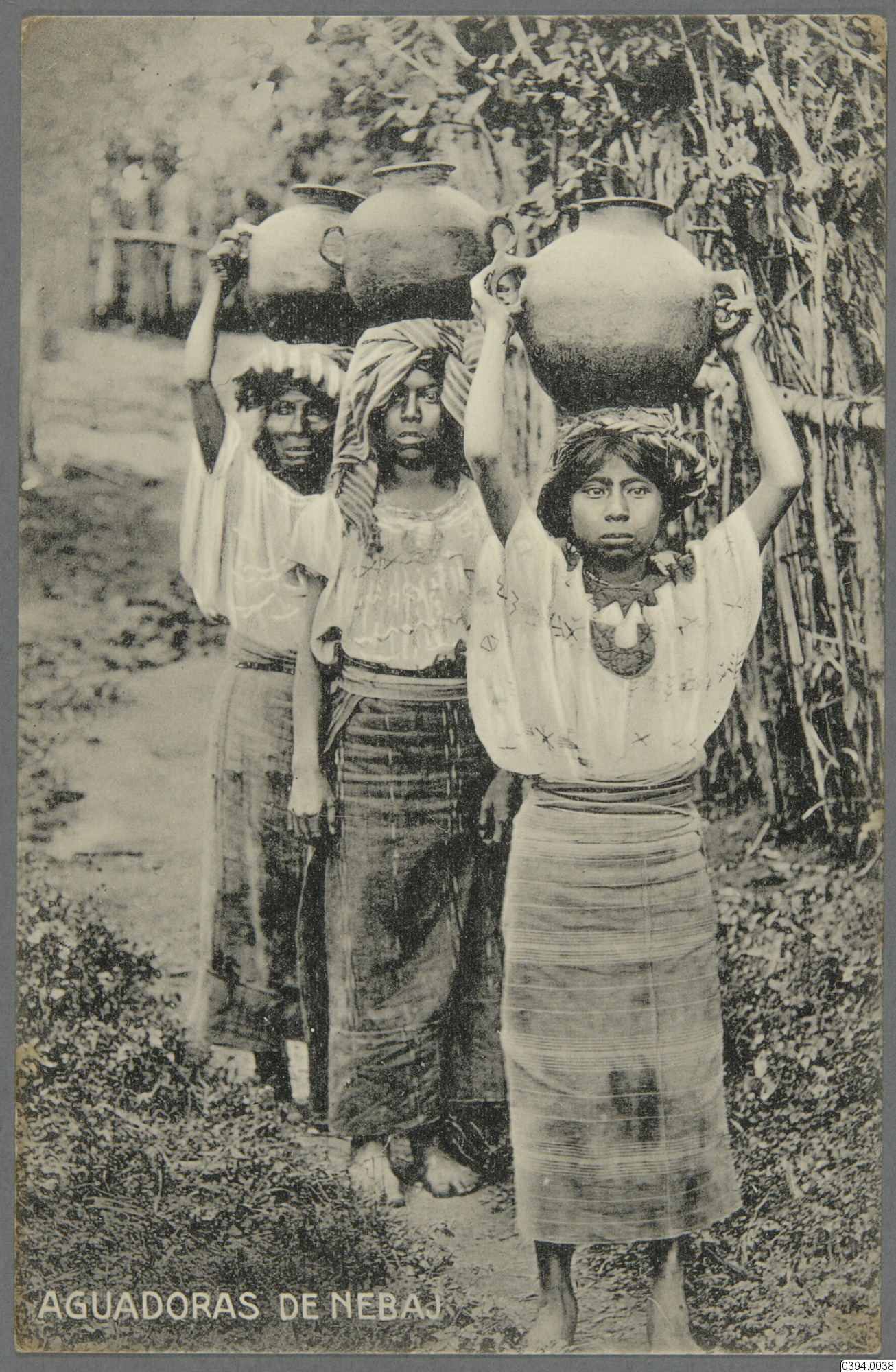 Vykort med motiv av tre kvinnor med vattenkrukor från Nebaj, Guatemala. Text på framsida: "India tejiendo tela" Text på baksida: Guatemala, Adolfo Biener, Guatemala, No. 52, Statens Etnografiska museum.