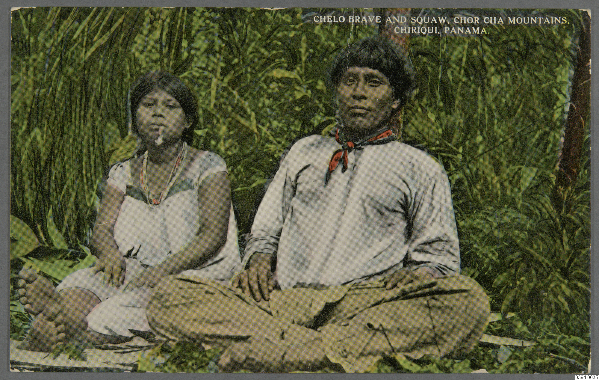 Vykort med motiv av Chelo Brave och Squaw sittande på marken. Text på framsida: "Chelo Brave and Squa W, Chor Cha Mountains, Chiriqui, Panama" Text på baksida: "Chelo Brave and Squa W, Chor Cha Mountains, Chiriqui, Panama. The estimated population of Indian Tribes according to the 1911 census report of the Smithsonian Institute is 26.000. They are not hostile, and trade with the natives, they raise corn, yams, oranges and other fruit and vegetables and make articles for their own use. Republica de Panama, Tarjeta Postal, Union Postale Universelle (Post Card Carte Postale) Address only on this side. Place Postage Here, Domestic Island Possessions Canada Cuba Mexico Panama, 1 c, Foreign 2 c, Published by Vibert & Dixon, Kodaks, Magazines, etc., Panama. No. 380. Statens etnografiska museum"