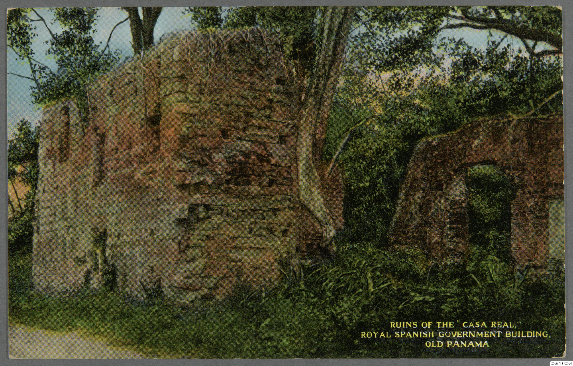 Vykort med motiv ruindelar, spansk regeringsbyggnad. Text på framsida: "Ruins of the 'Casa Real' Royal Spanish Government Buildning, old Panama" Text på baksida: "Ruins of the 'Casa Real' Royal Spanish Government Buildning, old Panama. Old Panama is situated about six miles southeast of Panama City and can be reached over a good auto road or by boat. Since the old town was burned by Morgan in 1671 there is nothing but ruins remaining, these however from items of much historic interest to visitors. Republica de Panama, Tarjeta Postal, Union Postale Universelle (Post Card Carte Postale) Address only on this side. Place Postage Here, Domestic Island Possessions Canada Cuba Mexico Panama, 1 c, Foreign 2 c, Published by Vibert & Dixon, Kodaks, Magazines, etc., Panama. No. 321. Statens etnografiska museum"