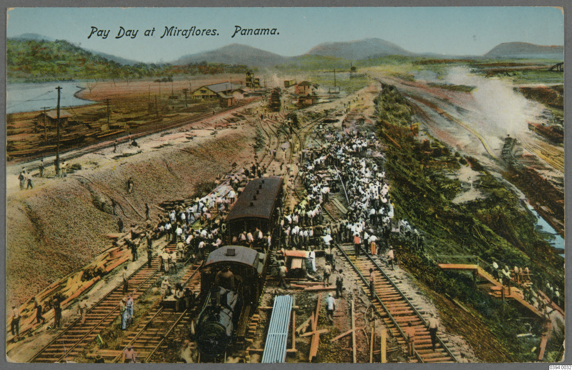 Vykort med motiv av löneutbetalning till arbetare vid Panamakanalen. Text på framsida: "Pay Day at Miraflores" Text på baksida: "Post Card, Place Postage Here, Domestic Island Possessions Canada Cuba Mexico Panama, 1 c, Foreign 2 c, Vibert & Dixon, Kodaks, Magazines, etc., Panama. No. 133. Statens etnografiska museum"