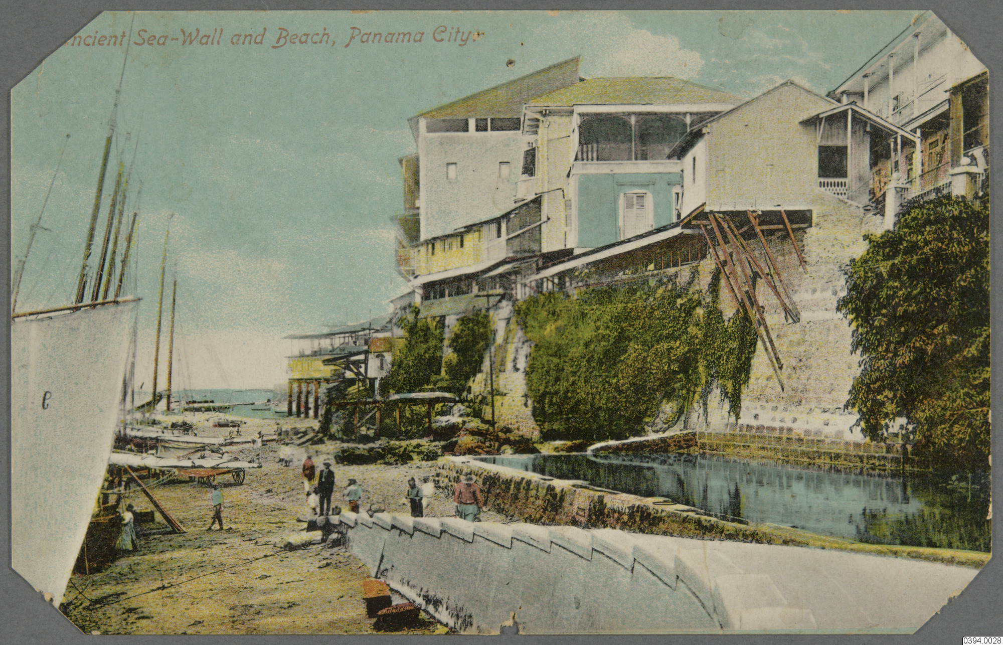 Vykort med motiv av strand med strandvall, båtar och hus, Panama City. Text på framsida: "? Sea-Wall and Beach, Panama City" Text på baksida: "Post Card, Place Postage Here, Domestic Island Possessions Canada Cuba Mexico Panama, 1 c, Foreign 2 c, Vibert & Dixon, Kodaks, Magazines, etc., Panama. No. 132. Statens etnografiska museum"