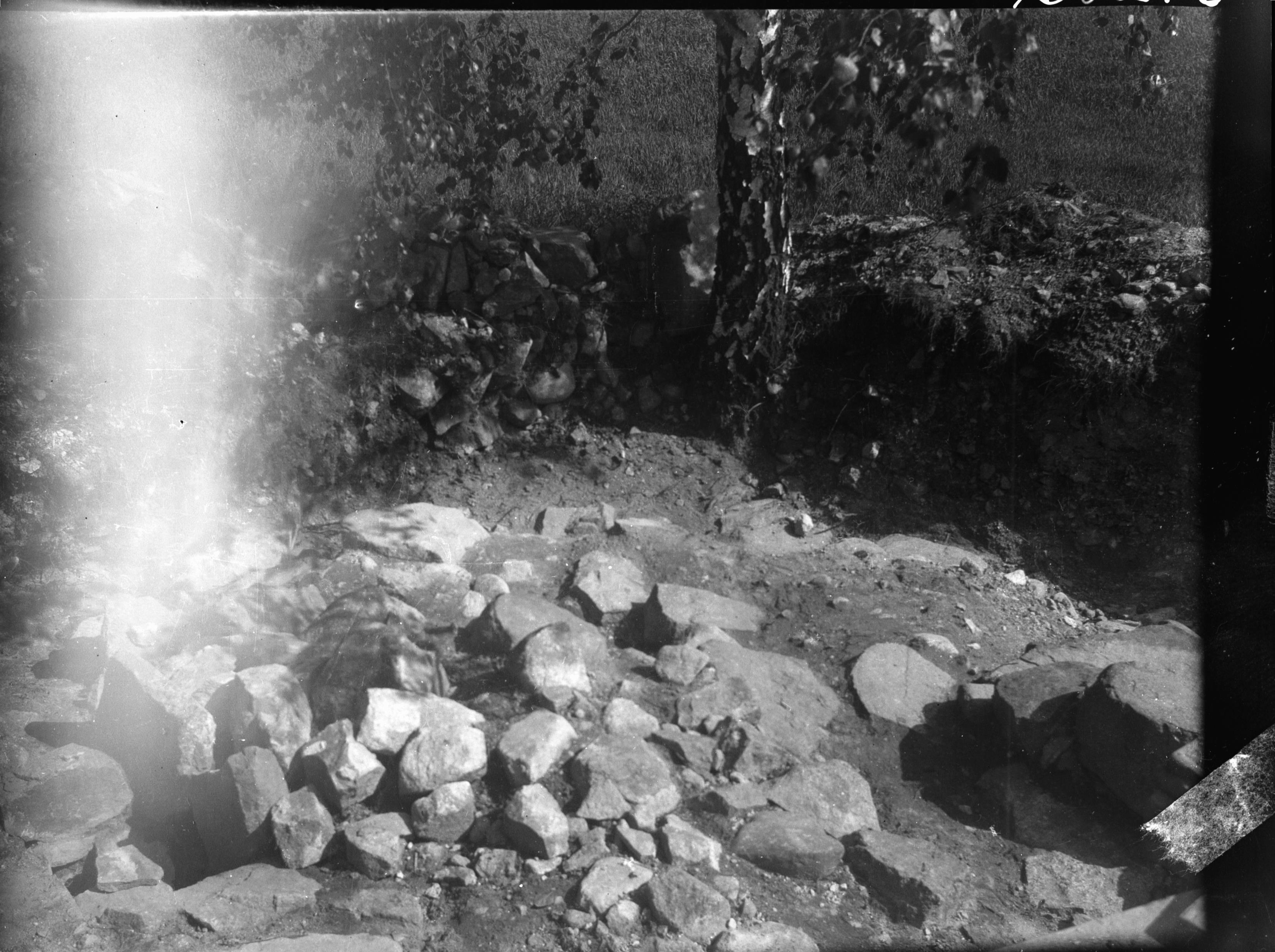 Kyrkoruinen, korets östra del med altargrunden samt piscinan längst ned i korets västra hörn.