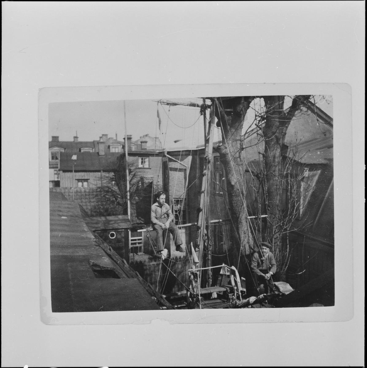 Nedtagning av Ask i trädgården på Fregattgatan 13A hos f.d. elektromekaniker Edvin Lindström, sonen Arne (med skepparmössa) deltar i rivning av upprigade lekmast 1929.