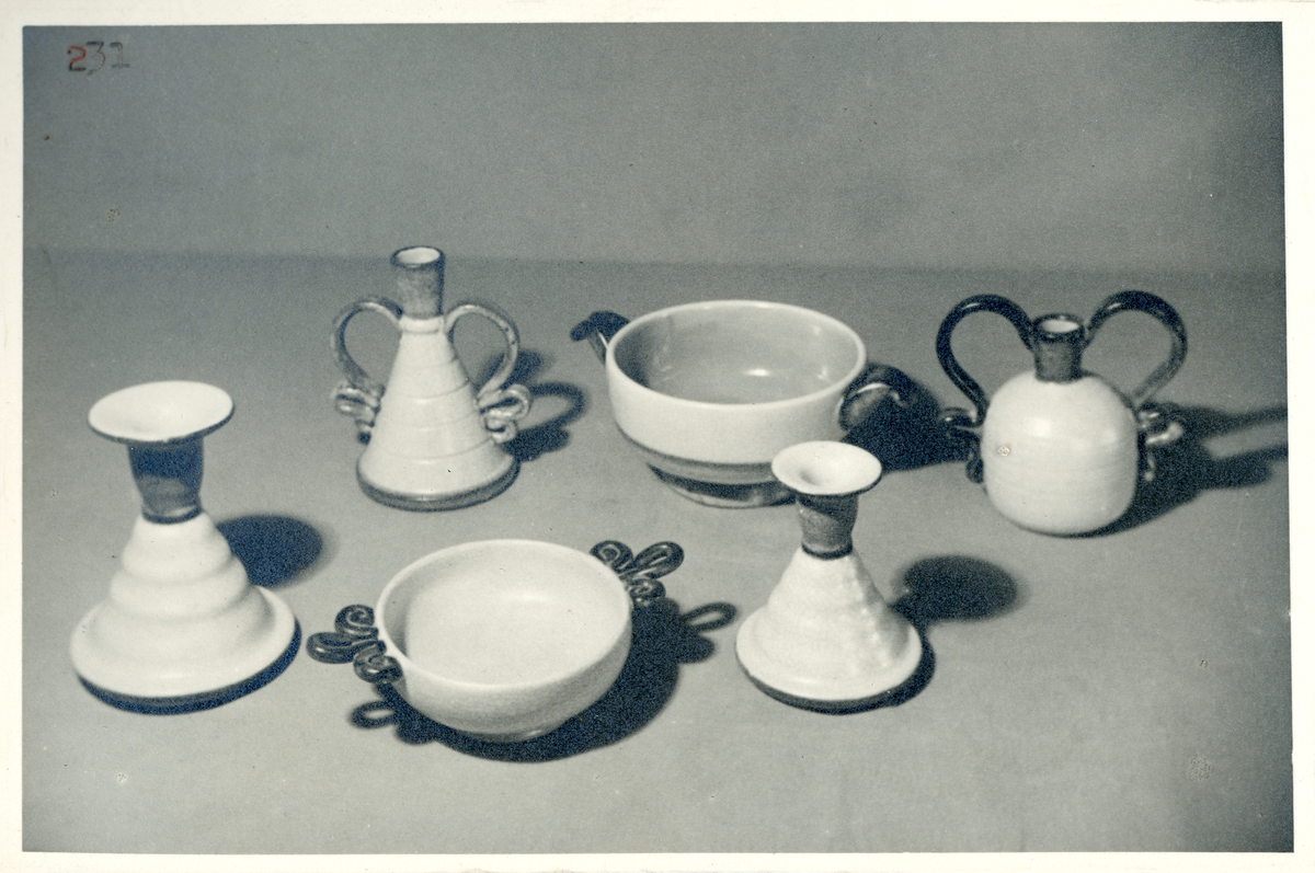 Ljusstakar och skålar från Bo Fajans, formgivna av Eva Jancke-Björk samt Alan Ebeling, 1900-talets mitt.
