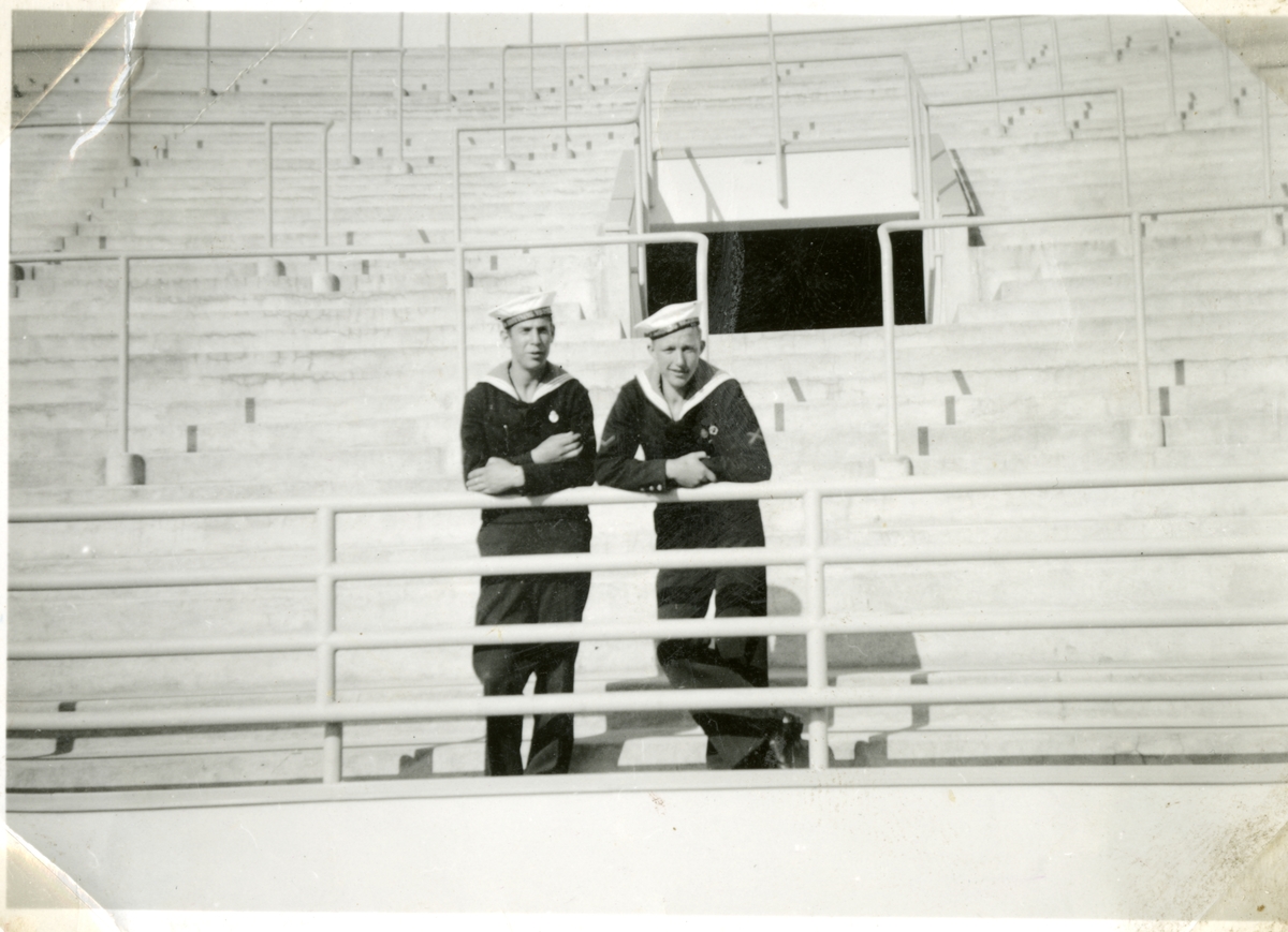 Bilden visar två svenska sjömän som verka stå i en idrottsarena.