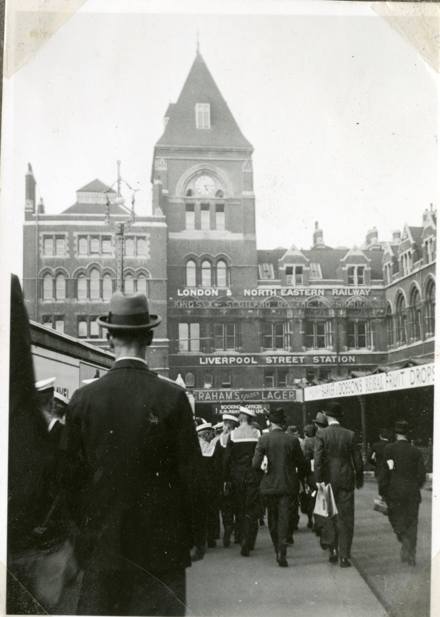 Bilden visar stadslivet utanför Liverpool Street station i London.