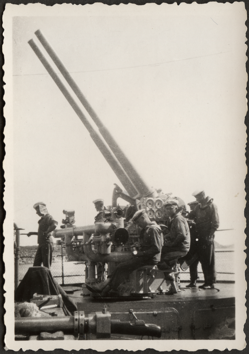 Bilden visar skeppsgossar som utbildas på en 75 mm dubbel luftvärnskanon ombord på Gotland.