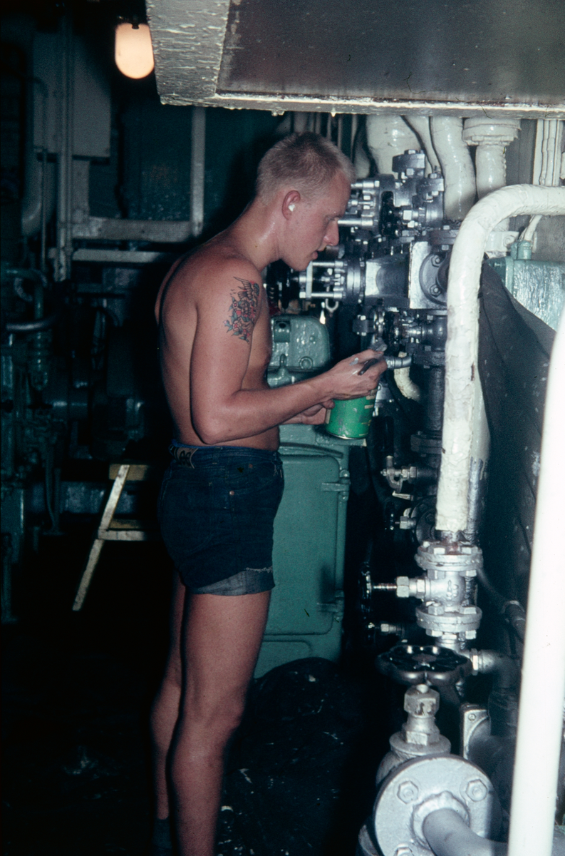 Besättningsman utför måleriarbete i maskinrummet på M/S NORDSTJERNAN.