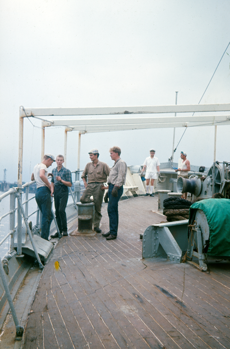 Besättningsmän samlade på däck på M/S NORDSTJERNAN före avgång.