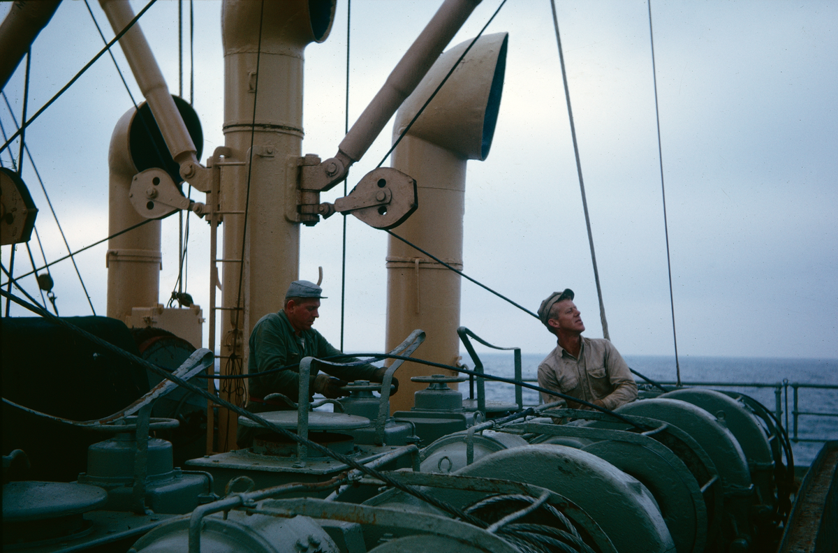 Två bestättningsmän vid vinscharna på däck på M/S NORDSTJERNAN.