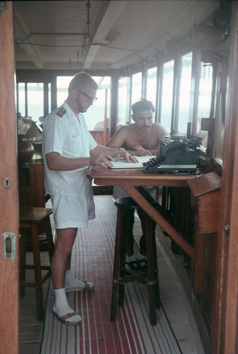 Besättningsmän vid telegrafen på bryggan ombord på M/S NORDSTJERNAN.