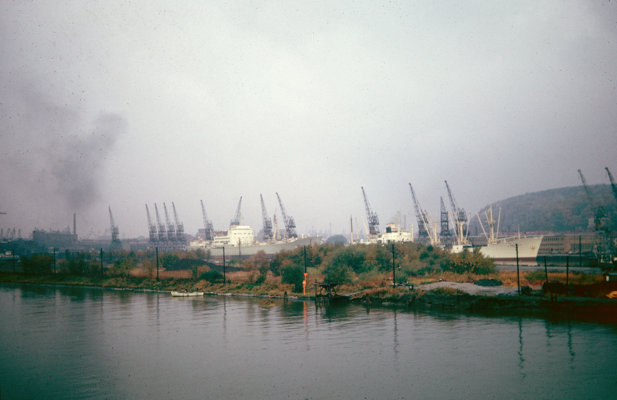 Höstvy över inloppet till Göteborg. Hamnkranar, rök från skorsten, fartyg och eka.