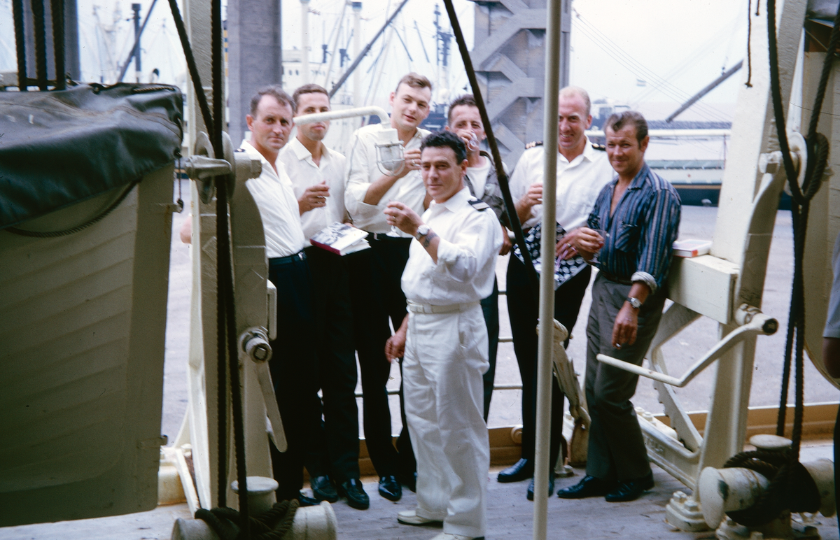 Julafton ombord på M/S NORDSTJERNAN med julklappsutdelning från Svenska kyrkan. Skålande besättningsmän.