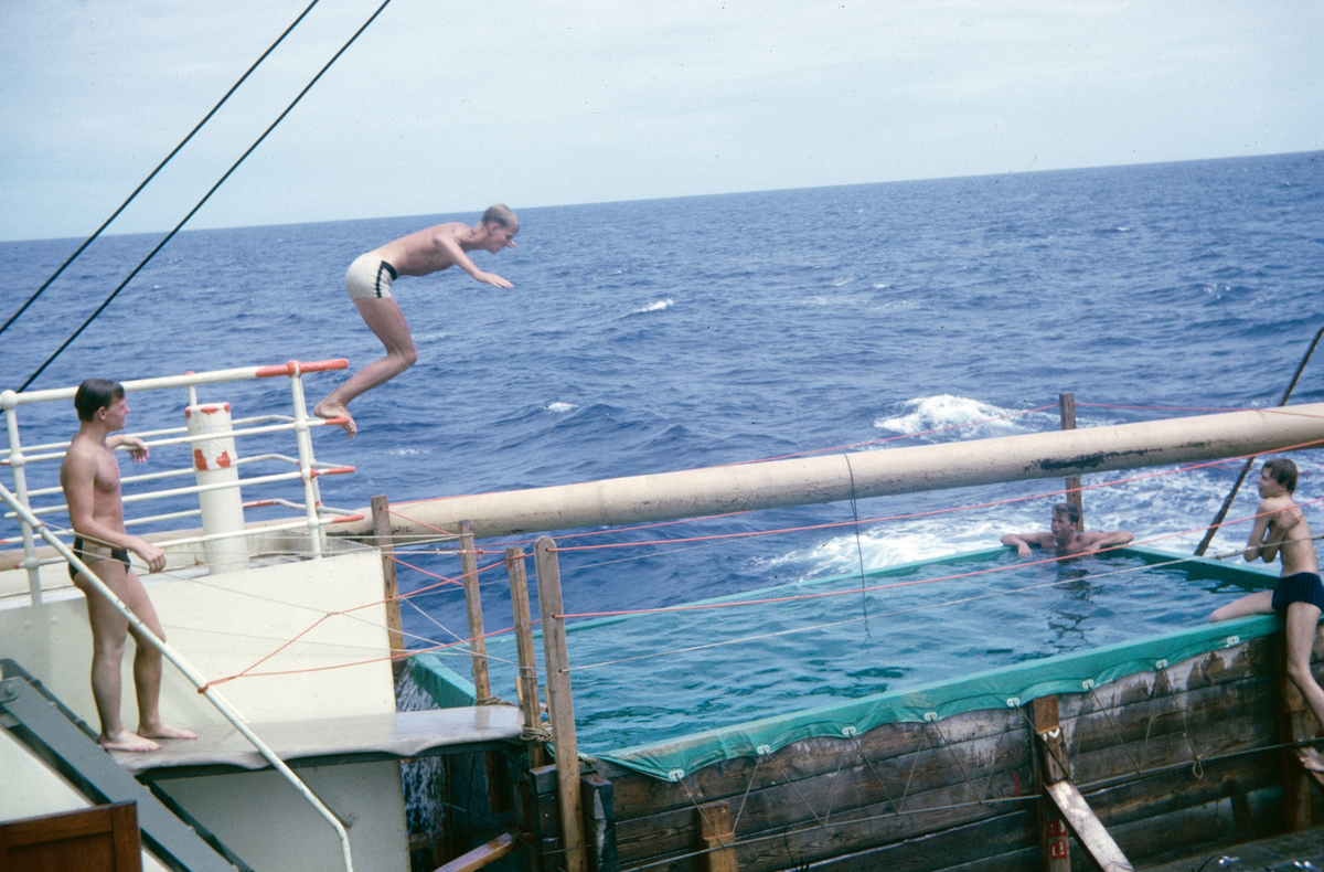 Fritid ombord. Dopp i simbassäng på däck på M/S NORDSTJERNAN.