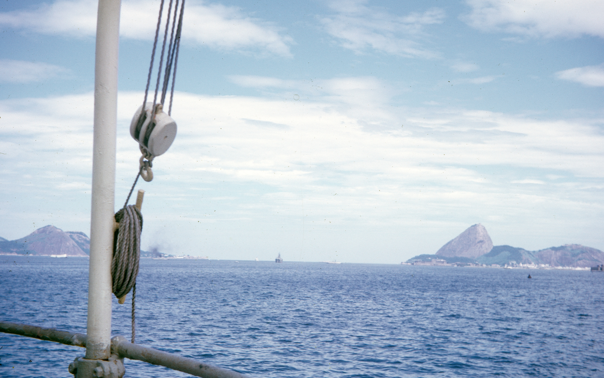 Vy över Rio de Janeiro från däck på M/S NORDSTJERNAN med repblock i bild till vänster.