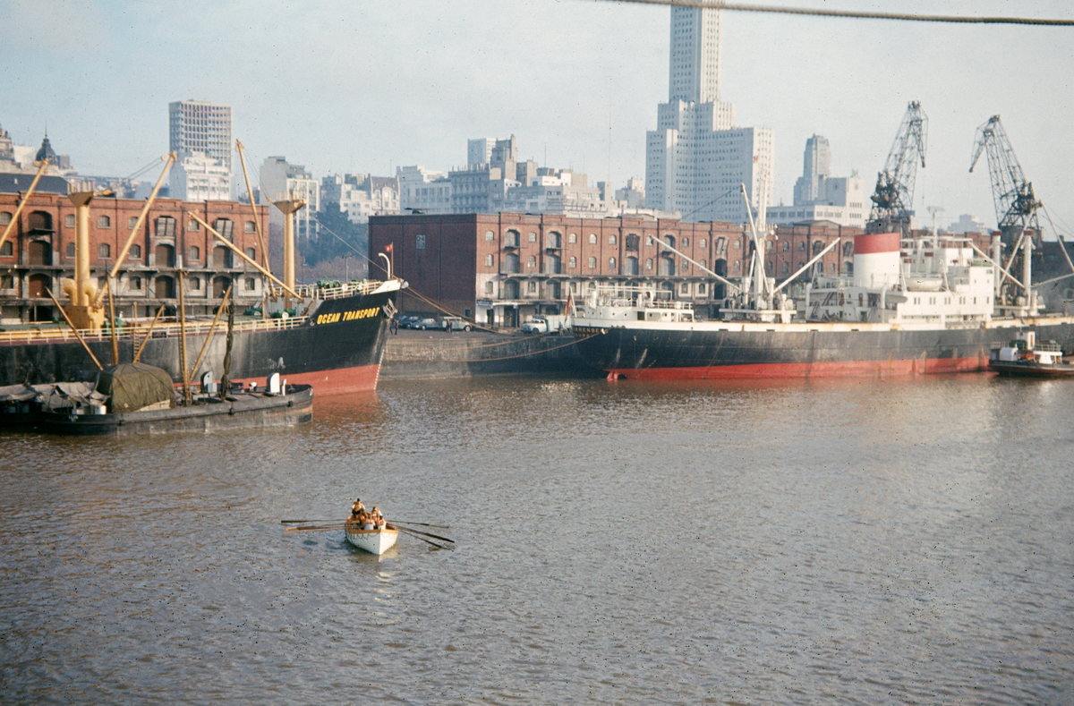 Livbåtsövning med besättningen på M/S NORDSTJERNAN. Livbåten rors in till hamnen där andra fartyg ligger förtöjda.