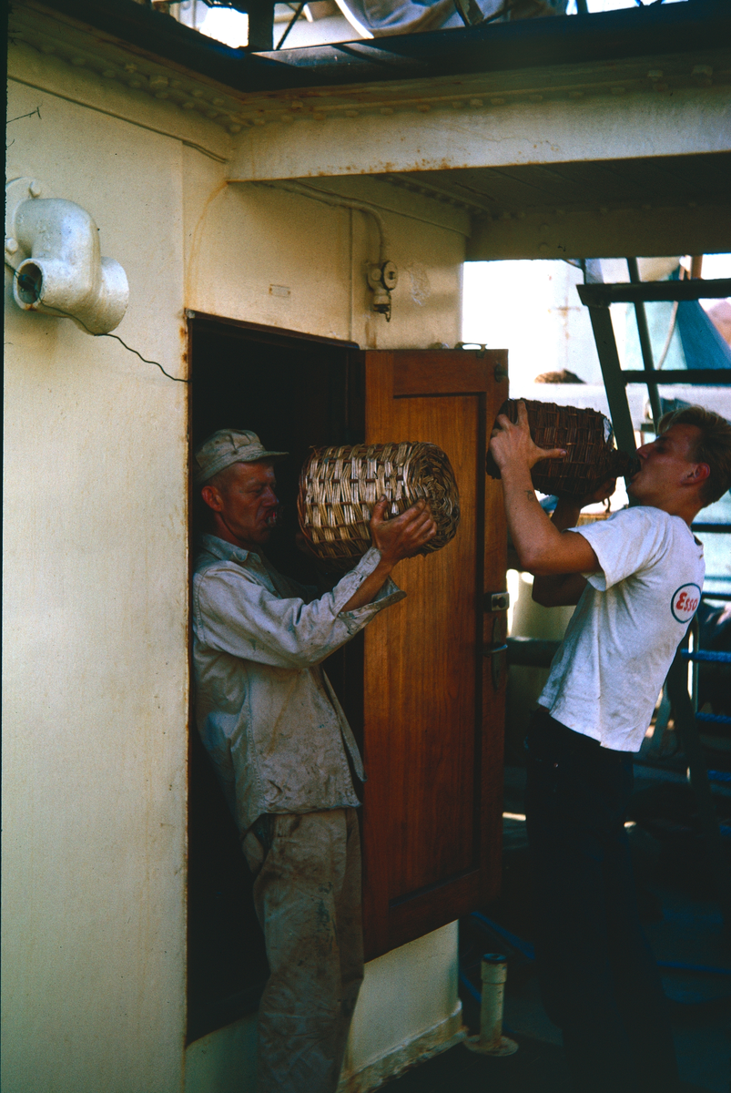 Fritid ombord på M/S NORDSTJERNAN. Peter Lindquist och en arbetskamrat dricker vin ur damejeanner på däck.