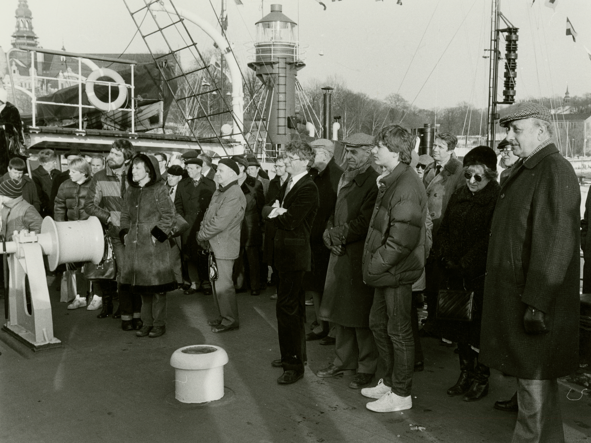 Vernissage för utställningen "Vintersjöfart" på isbrytaren SANKT ERIK. Gäster lyssnar på invigningstalet.