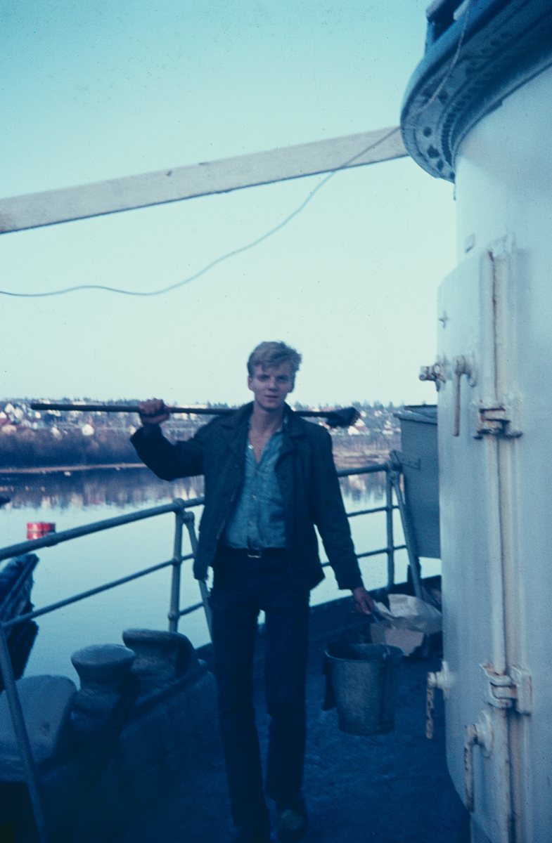 Besättningsmannen Peter Lindquist med städutrustning på däck på M/S NORDSTJERNAN.