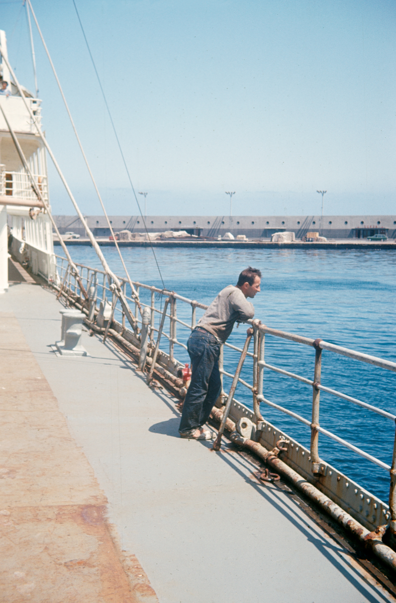 Besättningman lutar sig över relingen på M/S NORDSTJERNAN.