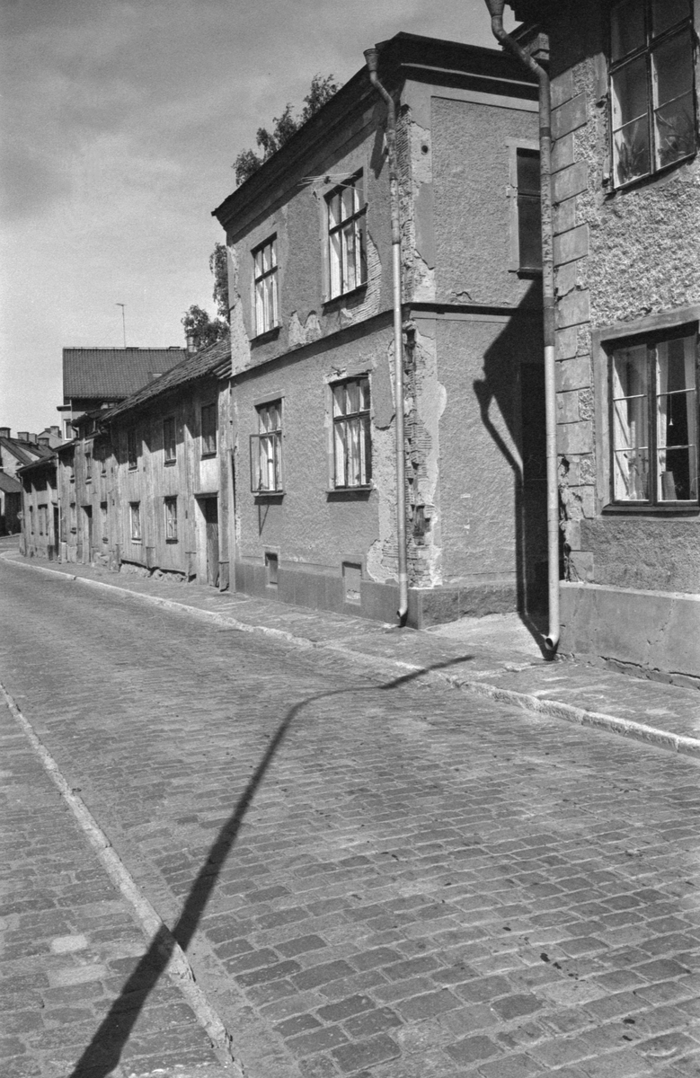 Slitna fasader utmed Hunnebergsgatan i Linköping. I blickfånget Hunnebergsgatan 5, reveterat och spritputsat trähus i två våningar. Antagligen uppfört omkring 1840. Vid tiden var husen längs gatans sträckning vid kvarteret Aspen rivningshotade, vilket för nr 5 kom att bli en realitet 1974. Övriga räddades lyckligtvis för att tjäna som hantverksgårdar eller integreras i servicehuset Aspen.