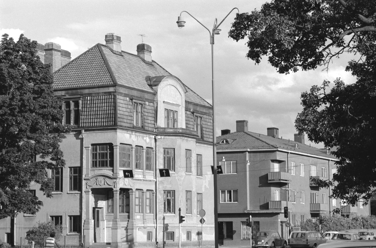Hamngatan 17 i Linköping prydde tills det revs hörnet av Hamngatan och Drottninggatan. Husets slutna, kubiska form i kombination med ett högt och brutet tak gav bygganden karaktär. Det var uppfört åren 1908-09 efter ritningar av Janne Lundin och det vackra huset kunde teoretsikt kunnat stått kvar. Rivningstomten står i skrivande stund i princip obrukad. Även Hamngatan 19, påföljande fastighet i bilden, är riven, men är vid sidan av direkt berörda sannolikt inte lika saknad. Foto 1975.