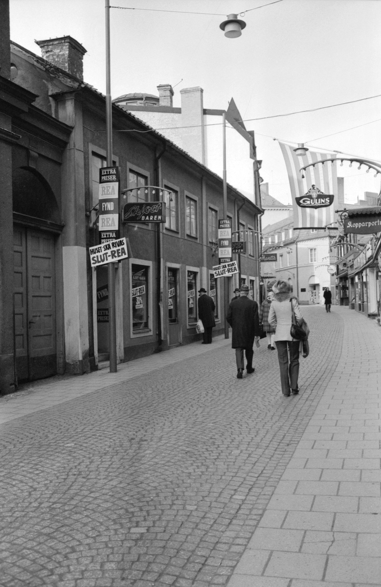 Utmed gågatan Tanneforsgatan i Linköping 1974. Lätt igenkänlig vy för den som är förtrogen med staden. Det äldre huset närmast till vänster revs dock under fotoåret och ersattes med det större affärs- och kontorshus som sedan dess fyller kvarterets södra delar. Sist ut i fastigheten var Skjort- & Byxbaren som drevs av köpmännen Sigvard Ahrén och Karl-Wallis Isaksson.