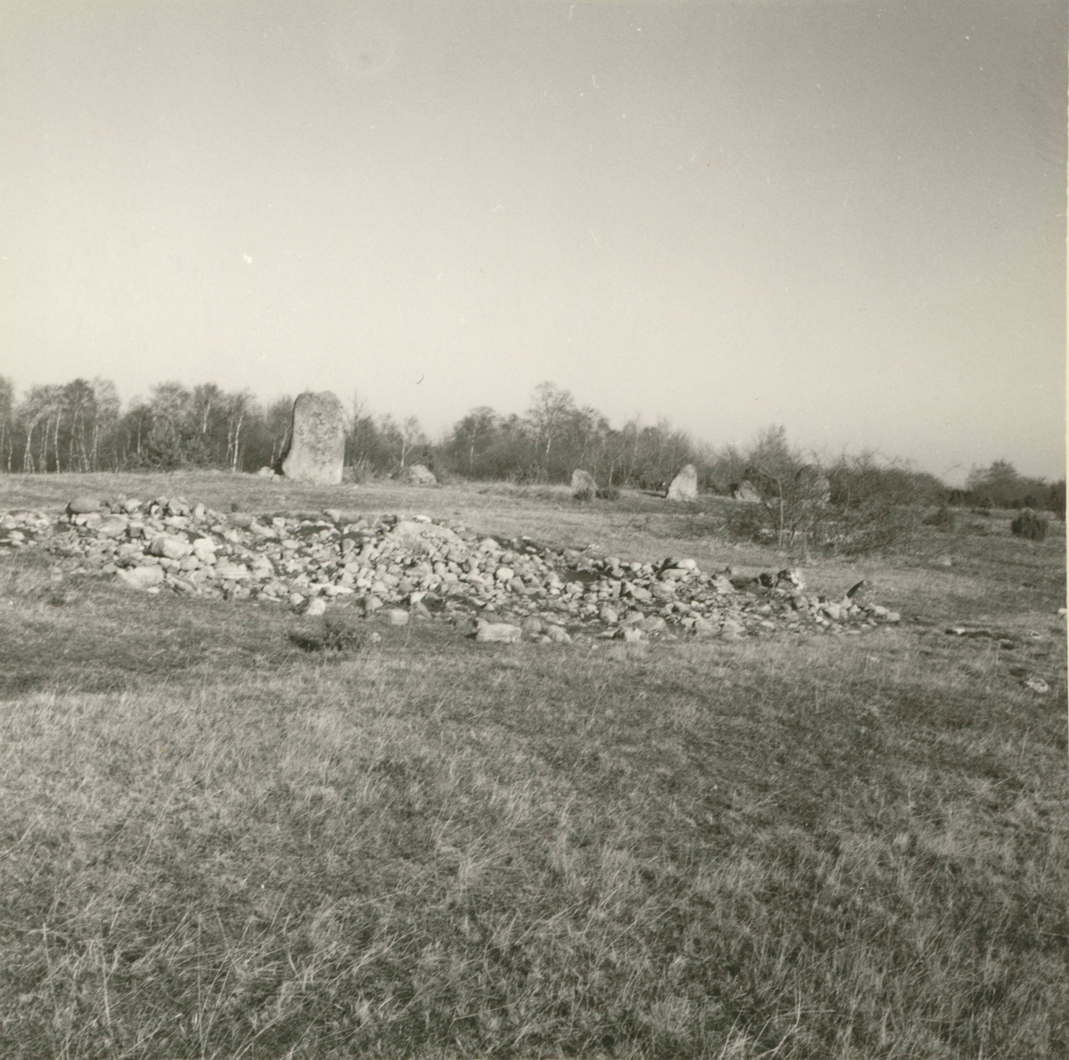 Parti av gravfältet på Holmetorp 4:3. Foto från sydväst. I förgrunden resterna av ett odlingsröse, borttaget till vägfyllnad.