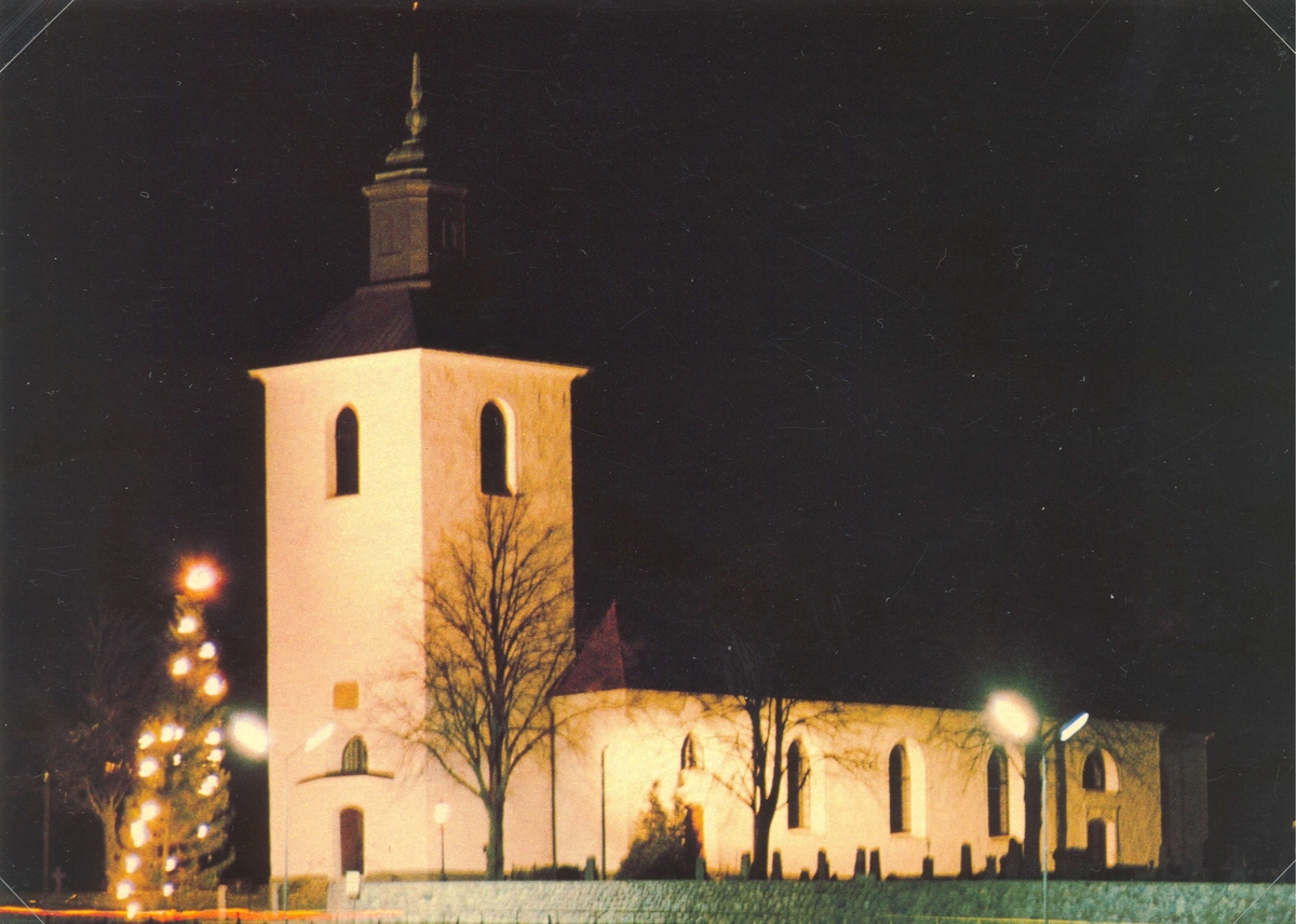 Söderåkra kyrka, även kallad Sofia Magdalena kyrka, med fasadbelysning juletid.
