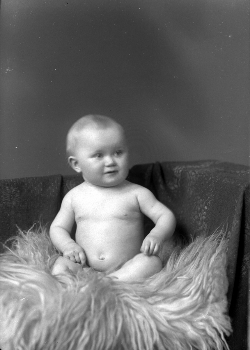 Ateljébild. Ett spädbarn på en fårfäll. Enligt Walter Olsons journal är bilden beställd av fru A Olsson.