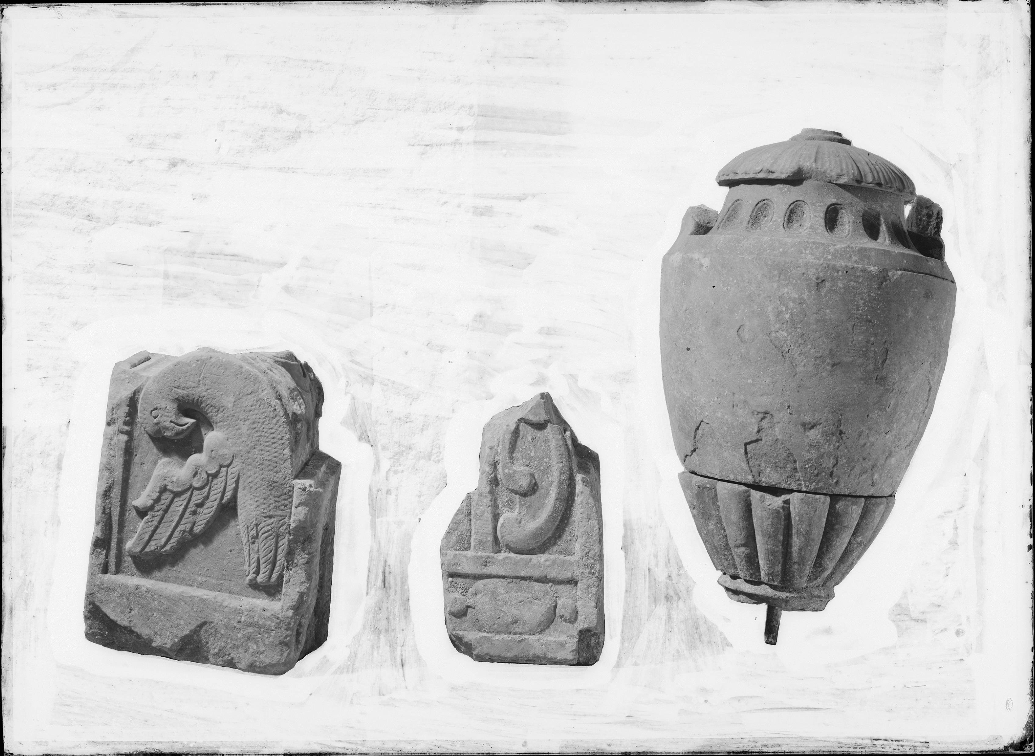 Konsoler, två stycken, samt urna från ett av gravkoren.