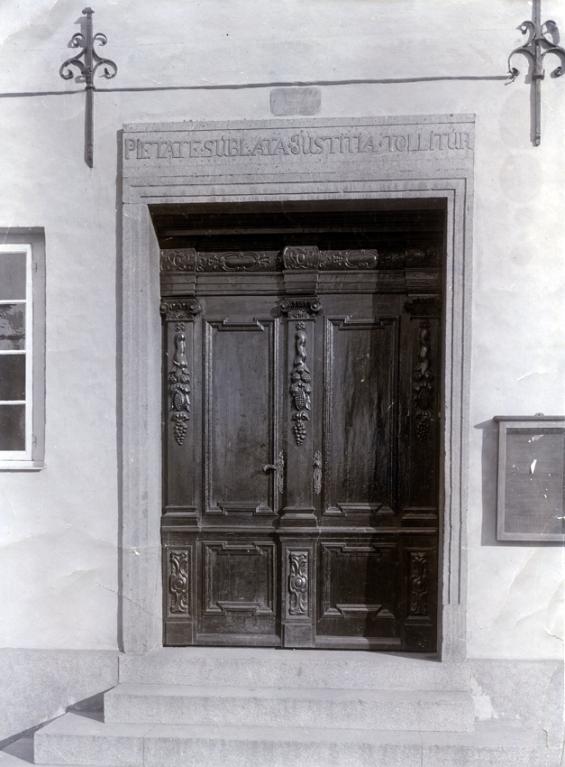 Detta är huvudingången till rådhuset i Kalmar. Porten är av ek.