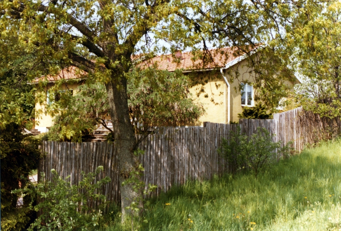 Ett gult bostadshus i putsad fasad bakom ett staket på Trollbackevägen. Ägaren hette Skillius och byggmästaren Bertil Danielsson.