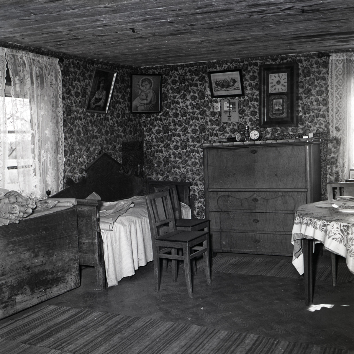 Interiör från boningshusets stora rum. Rummet sett från köket. Fars chiffonier och säng. Vid gavelfönstret ett slagbord.